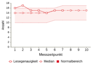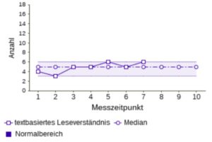 Die folgenden Beispielgraphen zeigen die Lernverlaufskurve und die typischen Informationen, die man durch eine Lernverlaufsdiagnostik erhält. Dargestellt werden die Leistungen im Bereich Lesen der fiktiven Schülerin Maria Mustermann aus der computerbasierten Lernverlaufsdiagnostik quop.