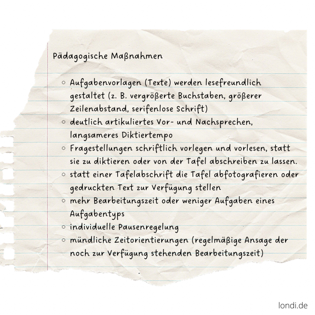 - Rechtschreibstörung: schriftliche Leistungserhebung ohne erheblichen Schreibaufwand gestalten, z. B. durch vorgefertigte Arbeitsblätter oder Multiple-Choice-Fragen