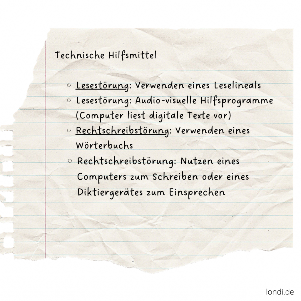 - Rechtschreibstörung: Nutzen eines Computers zum Schreiben oder eines Diktiergerätes zum Einsprechen