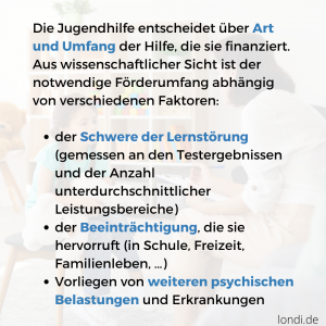 Wenn Kinder und Jugendliche von Lernstörungen betroffen sind und dadurch eine seelische Behinderung besteht oder droht und ihre gesellschaftliche Teilhabe beeinträchtigt oder gefährdet ist, können ihre sorgeberechtigten Eltern nach § 35a SGB VIII Eingliederungshilfe beantragen. Diese sieht zum Beispiel eine Kostenübernahme der Legasthenie- oder Dyskalkulietherapie durch die Jugendhilfe vor.