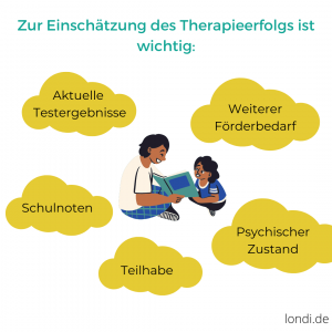Können die meisten dieser Punkte positiv beantwortet werden, scheint die Therapie grundsätzlich angemessen und hilfreich zu sein. Das Ende einer Maßnahme kann geplant werden, wenn die seelische Gesundheit nicht mehr beeinträchtigt bzw. die gesellschaftliche Teilhabe nicht mehr bedroht ist. Eine Weiterführung scheint dann sinnvoll, wenn weiterhin massive Lernschwierigkeiten bestehen, die das seelische Befinden als auch die gesellschaftliche Teilhabe beeinträchtigen bzw. gefährden. Hier ist im Individualfall zu prüfen, ob die Hilfsmaßnahmen bereits anschlagen und fortgesetzt werden sollten, oder ob ein Wechsel der ergriffenen Maßnahmen notwendig erscheint, um zukünftig Verbesserungen zu erzielen.